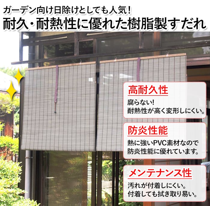 すだれ 簾 PVC 樹脂製 スダレ 耐熱 防炎性 日本製 日除け 屋外 涼しい 暑さ対策 夏 通風 目隠し 巻き上げ 高耐久性 腐らない 和風 風流 エコ 約88×160cm PVCすだれ 外吊りつよし くるっと付き (DA) 引っ越し 新生活