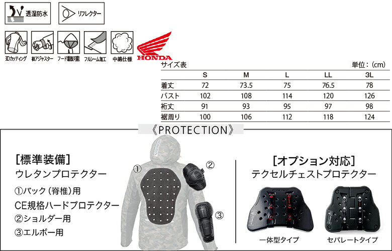 【Honda】【ホンダ】【プロテクトウインターパーカー】【ビッグサイズ 3L】EJ-Y3A-B ● サイズ:3L ● カラー:カモフラージュ・ブラック・スモークグレー ● 素材:表地:ポリエステル100%(PUコーティング) 裏地:ポリエステル100% 保温材:ポリエステル100%(ポケットは防水構造ではありません) ■ 立体メッシュ脊椎プロテクターポケット採用のカジュアルテイスト 透湿防水加工 初期耐水圧:8,000mm/平方cm 初期透湿性:5,000g/平方m/24h 透湿防水素材を使用した高機能ウインターパーカー。