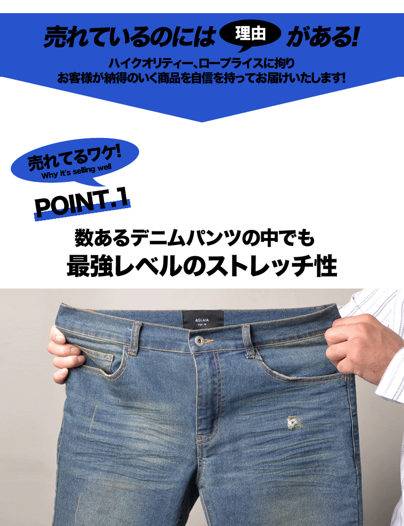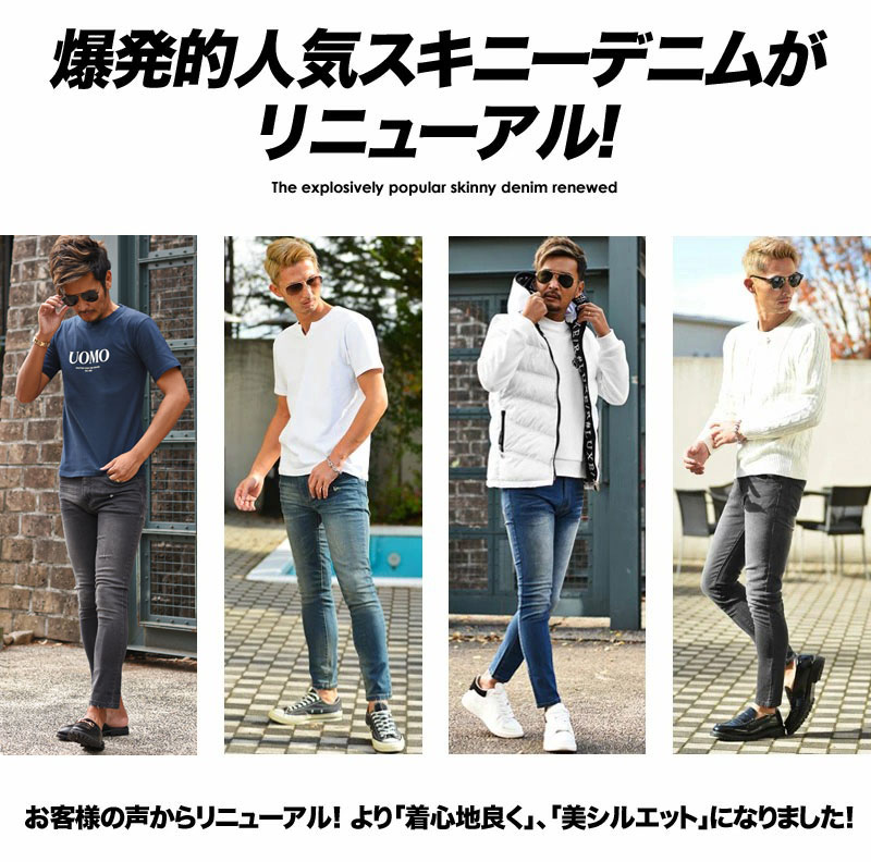 ◆サイズ◆ M:ウエスト78/股上25/股下67/ワタリ25/裾幅14 L:ウエスト81/股上26/股下68/ワタリ26/裾幅14.5 XL:ウエスト85/股上28/股下69/ワタリ27/裾幅16 [モデルサイズ]身長:178cm体重:65kg L着用 単位cm ◆カラー◆ ブルー/ネイビー/ブラック ◆素材◆ 綿74% ポリエステル25% ポリウレタン1% (関連カテゴリー;メンズカジュアル、ビター系ファッション、紳士ズボン、男性用ジーンズ、男性ジーパン men'sファッション、メンズスキニーデニム、メンズデニムパンツ)Coordinate items OUTER/10,780 TOPS/6,490 BOTTOMS/2,998 SHOES/ALEXANDER McQUEEN(アレキサンダーマックイーン) Coordinate items OUTER/15,180 TOPS/2,998 BOTTOMS/2,998 SHOES/Bottega Veneta(ボッテガヴェネタ) ◆商品詳細◆ ダメージありタイプとダメージなしタイプの2パターンから選択可能♪